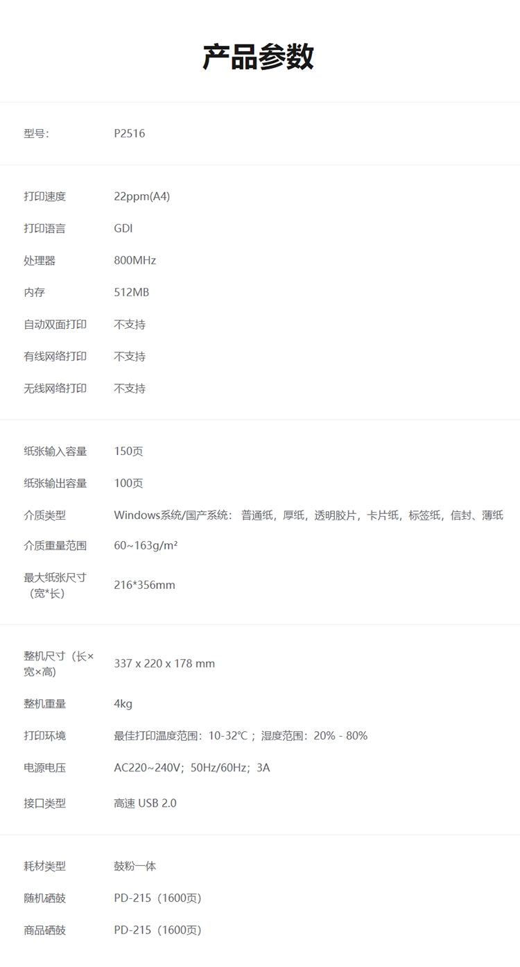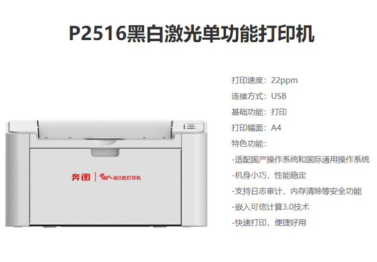 商品名稱:奔圖 A4黑白激光單功能打印機 P2516