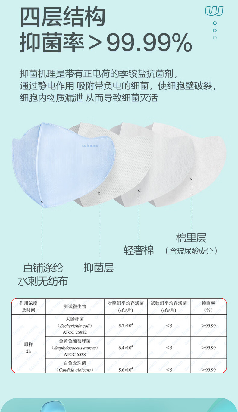 - 結(jié)構(gòu)及組成:40G直鋪滌綸水刺無紡布+30GPP抑菌層+玻尿酸30G全棉里層