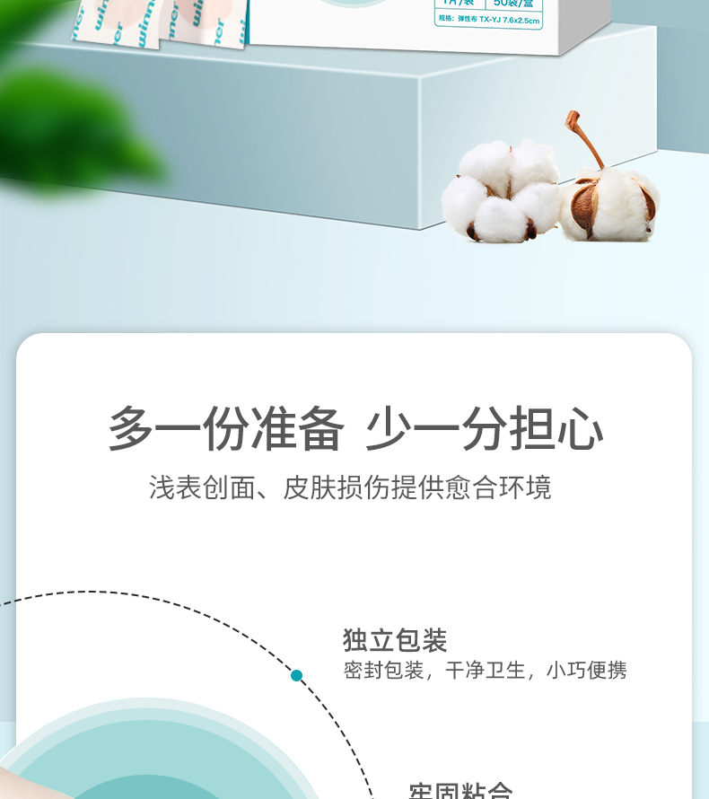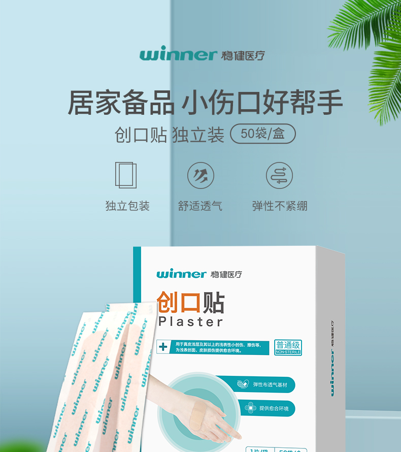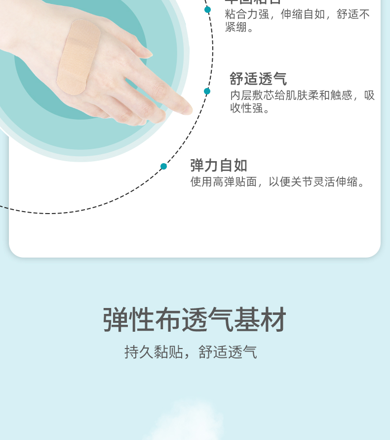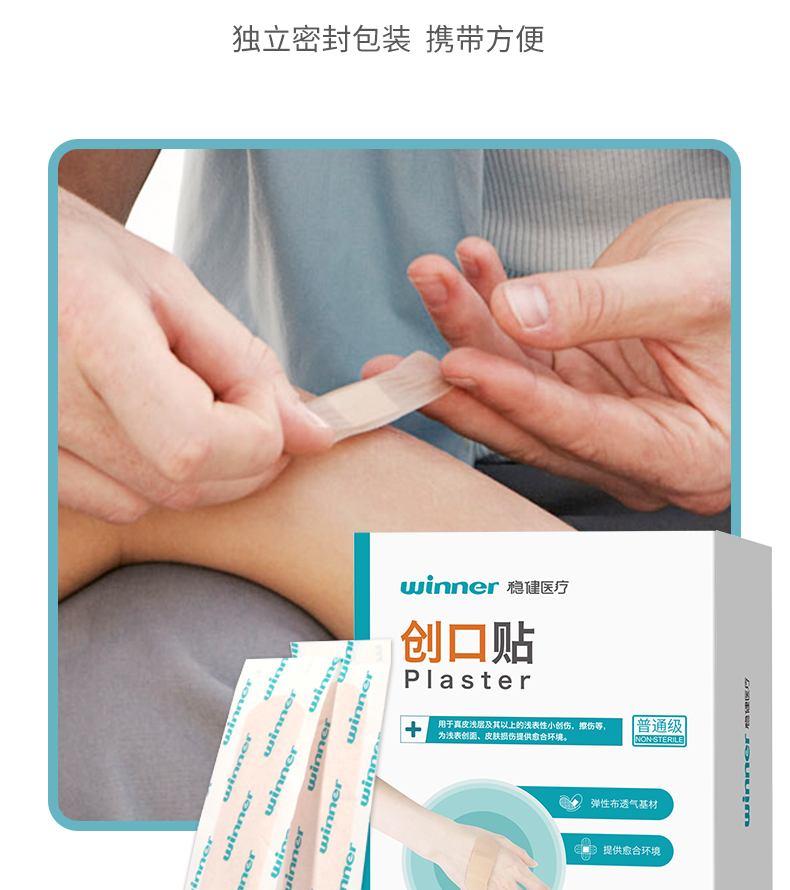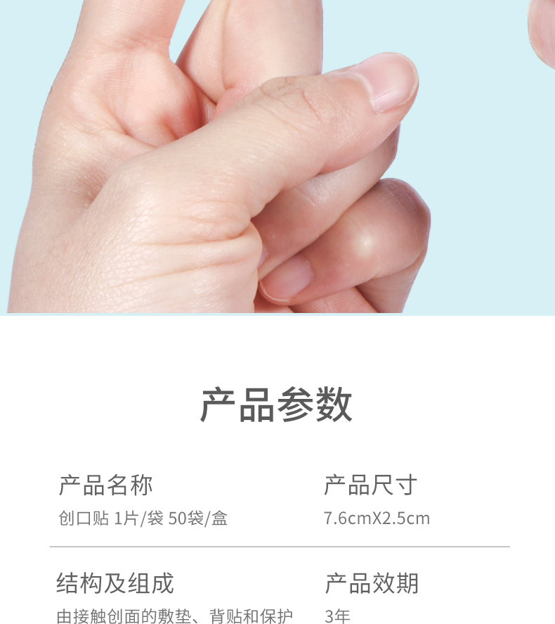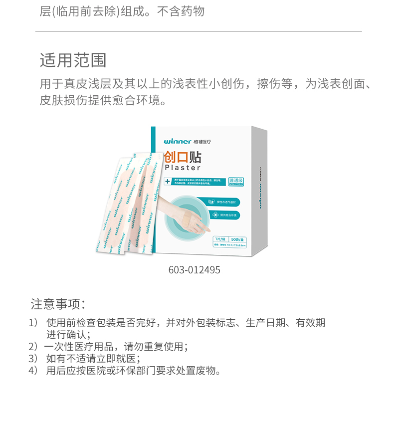 創(chuàng)口貼由接觸創(chuàng)面的敷墊、背貼和保護(hù)層(臨用前去除)組成。不含藥物。