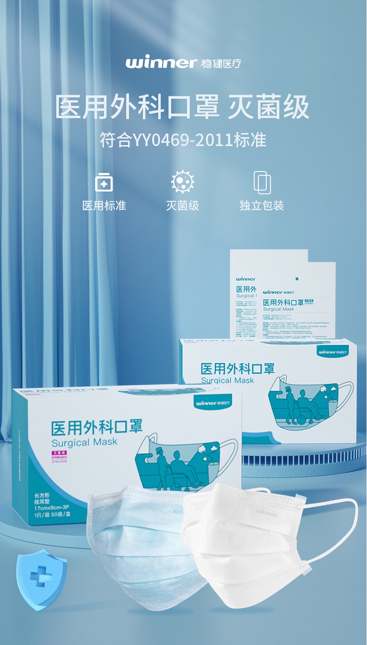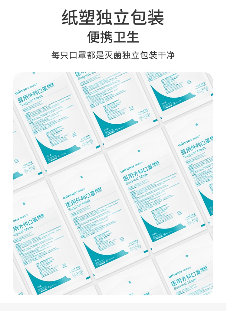 自營(yíng)醫(yī)用外科口罩 一次性醫(yī)用外科口罩 穩(wěn)健(Winner)一次性醫(yī)用外科口罩滅菌獨(dú)立裝100只 3層掛耳50袋/盒*2盒裝