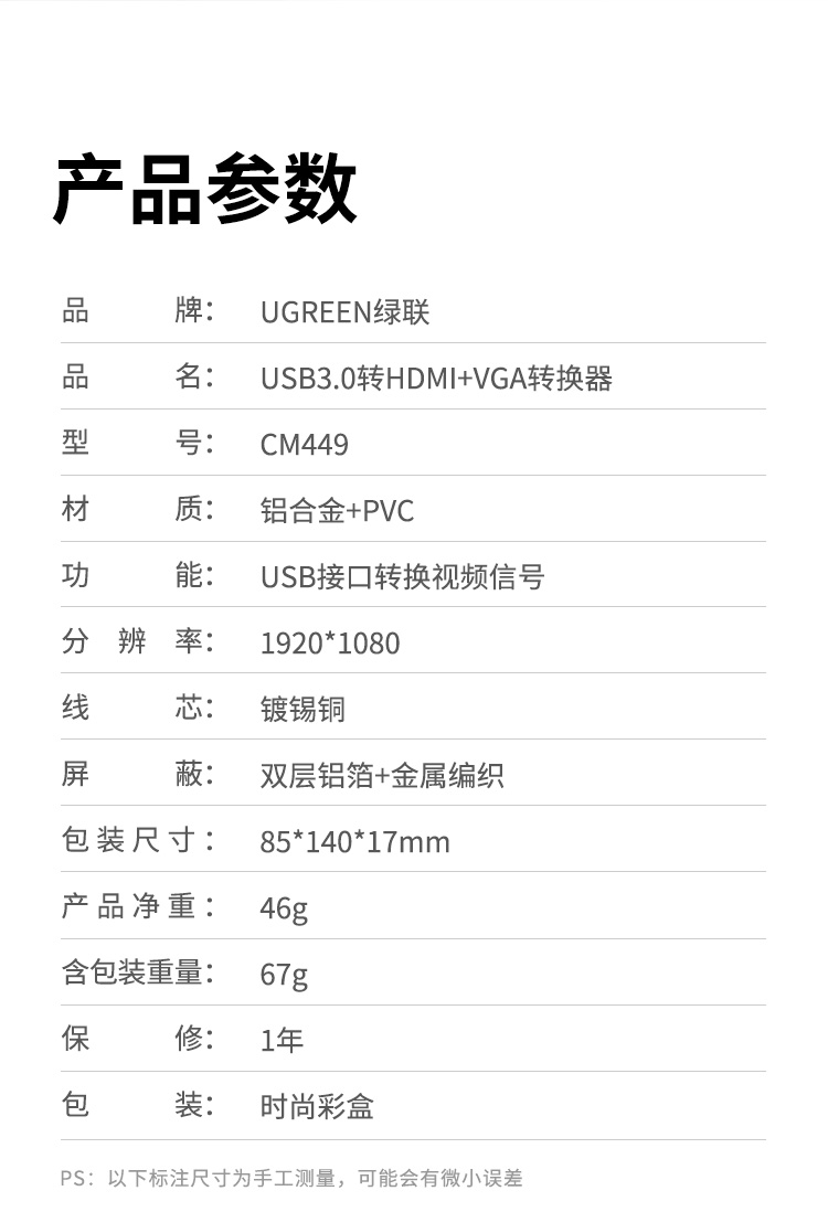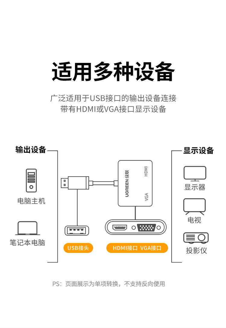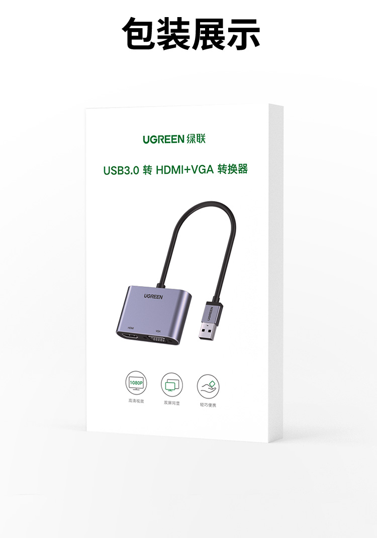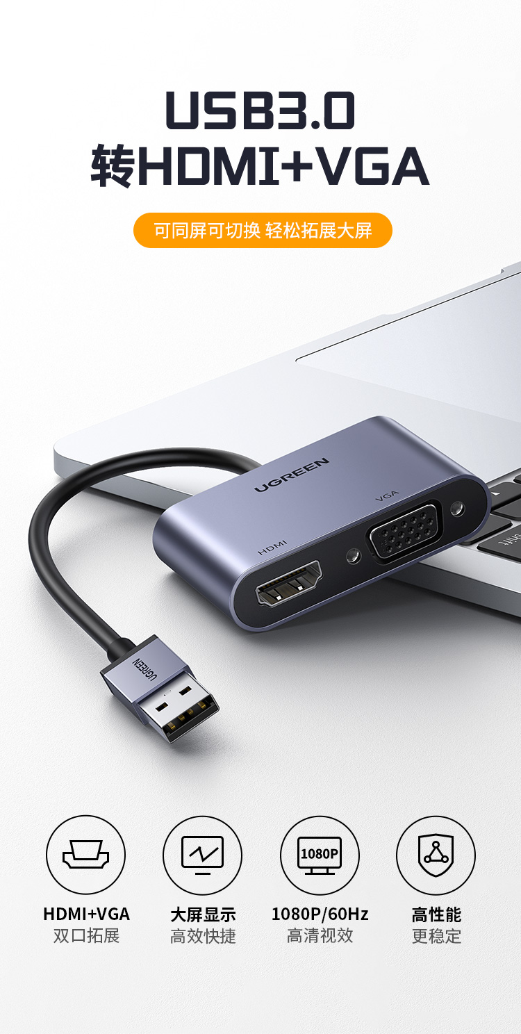 商品名稱:綠聯(lián) USB3.0轉(zhuǎn)HDMI/VGA轉(zhuǎn)換器 筆記本外置顯卡臺式機電腦接電視投影儀高清視頻同屏擴展轉(zhuǎn)接頭線 20518