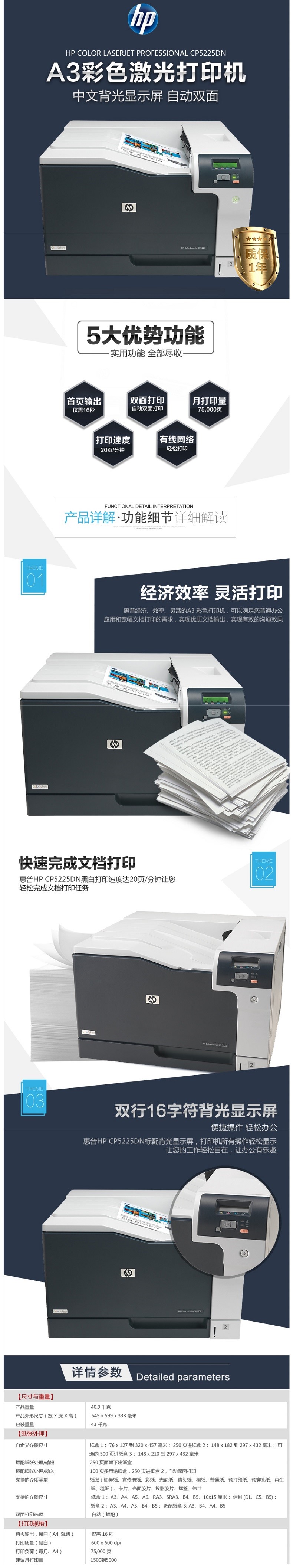 商品名稱:惠普 Color LaserJet Pro CP5225dn 彩色激光打印機 A3 灰黑色 僅打印、有線網(wǎng)絡(luò)、自動雙面(計價單位:臺)