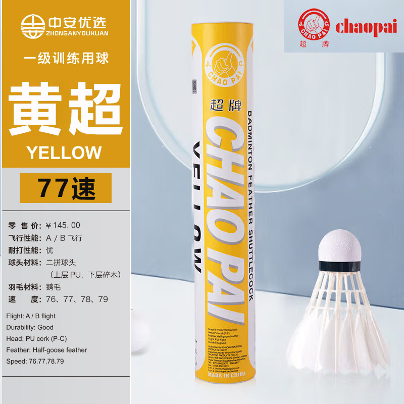 商品名稱:超牌黃超羽毛球 黃超77速 12只裝