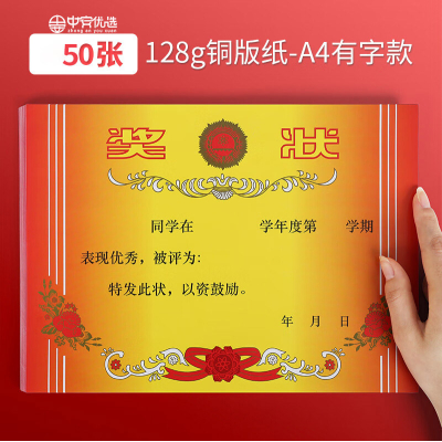自營(yíng)A4獎(jiǎng)狀紙 有字獎(jiǎng)狀A(yù)4 加厚銅版紙 50張/包