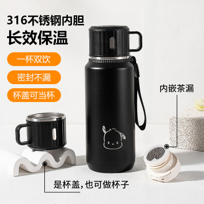 COOKSS保溫杯 大容量水杯 316不銹鋼便攜泡茶杯子帶蓋 黑色600ml